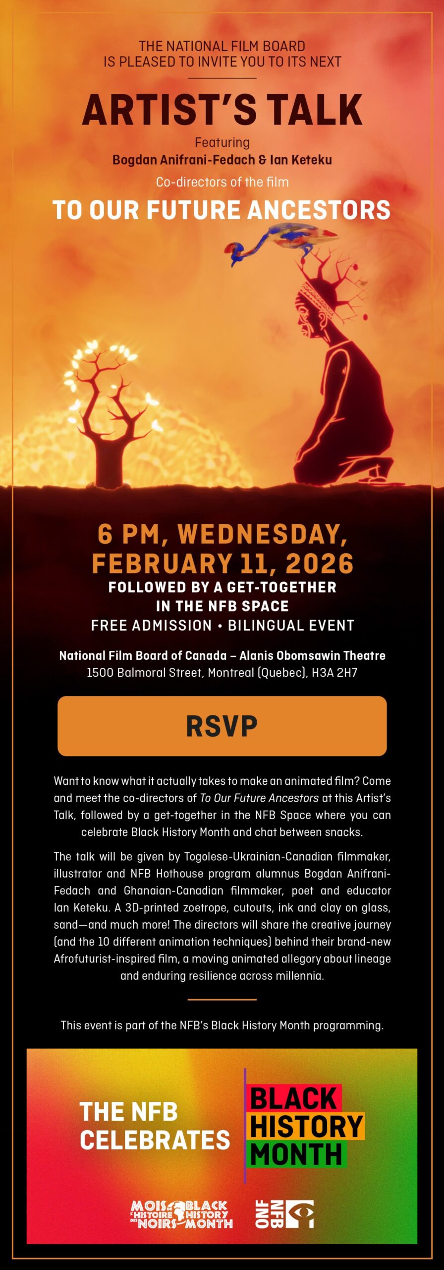 - Artist’s Talk featuring Bogdan Anifrani-Fedach and Ian Keteku, co-directors of the animated film To Our Future Ancestors